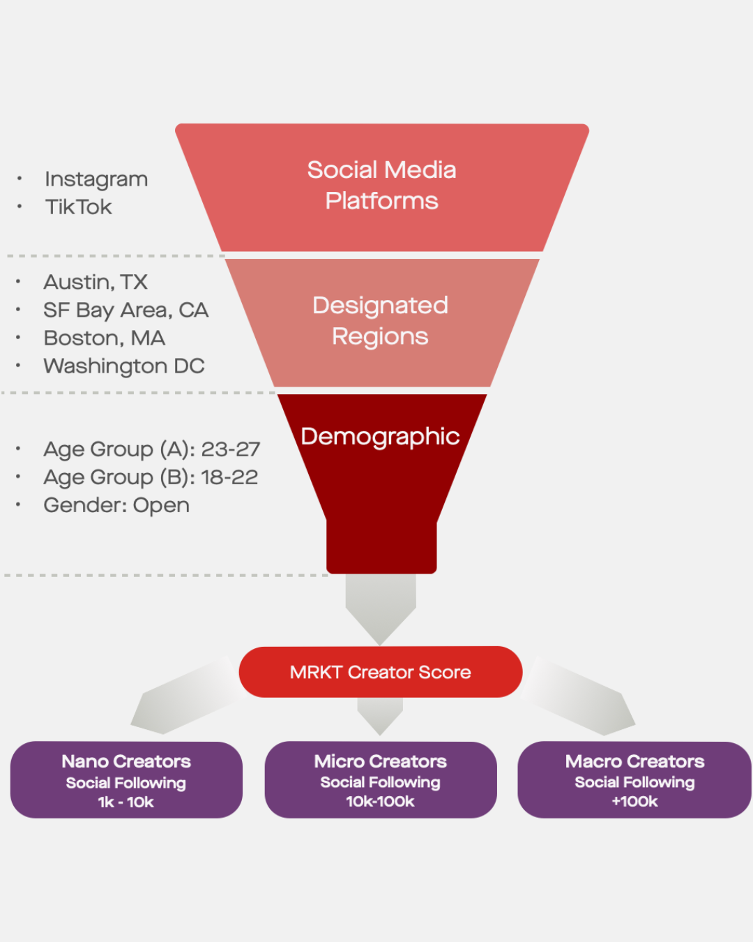 The MRKT Creator Quality Score is our proprietary scoring system to qualify the fit of a content creator with the brand’s core values and key objectives. The score is proportionally weighted to include the content creator age, geographic reach, and ability to influence audiences.